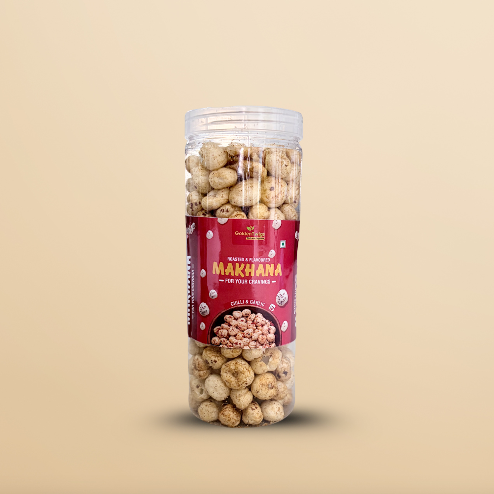 Bold, crunchy, and irresistibly flavorful, roasted makhana tossed in ghee, dried chilli, and dried garlic is a snack that packs both heat and goodness. The rich nuttiness of ghee enhances the light, airy crunch of makhana, while chilli adds a fiery kick and garlic brings a deep, savory aroma. Perfect for those who love a spicy twist, this wholesome snack is as satisfying as it is nourishing—ideal for guilt-free munching anytime.